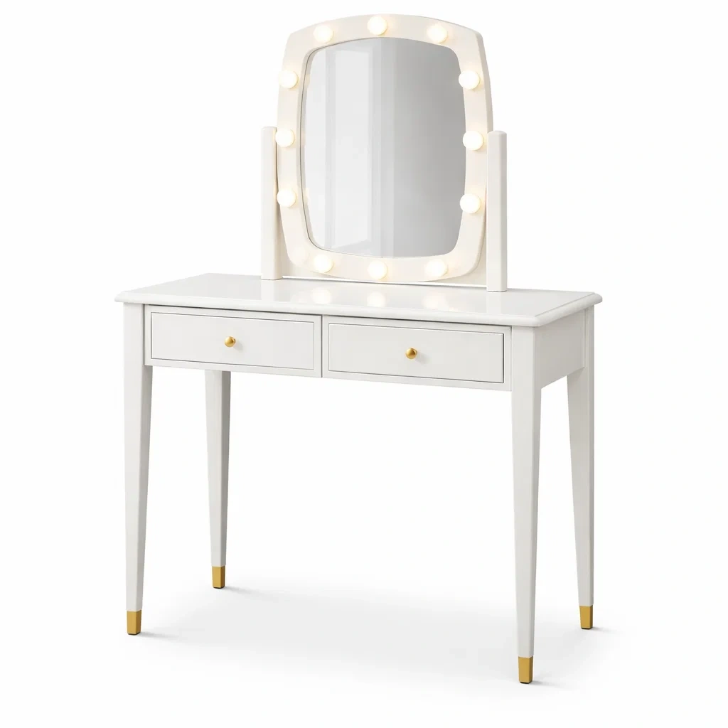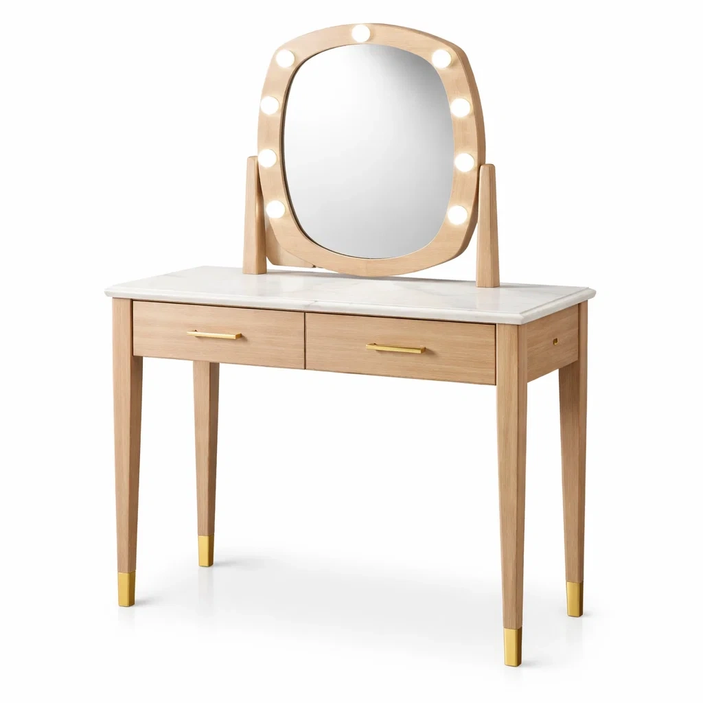Schminktisch aus Holz und Marmor mit beleuchtetem Spiegel und Schubladen