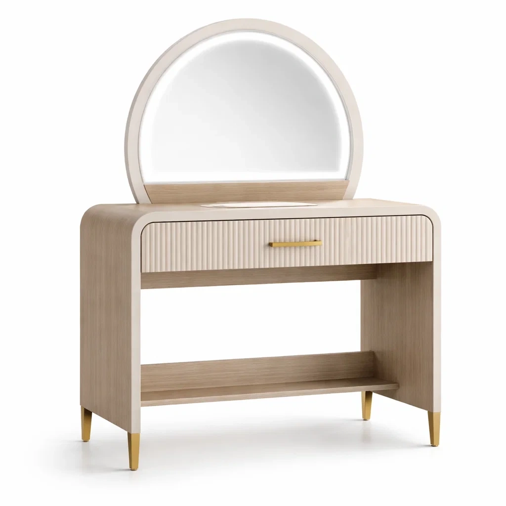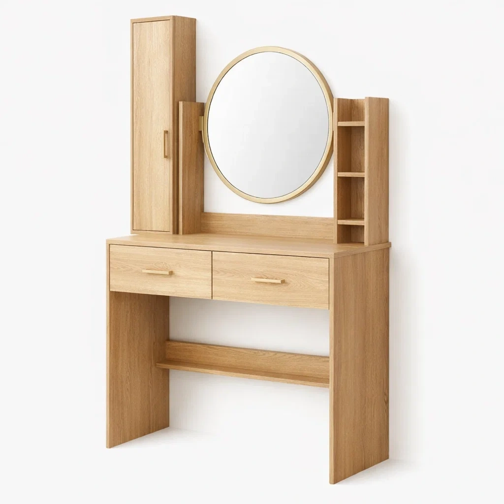 Schminktisch aus Holzfurnier Natur mit Rundspiegel und Stauraum