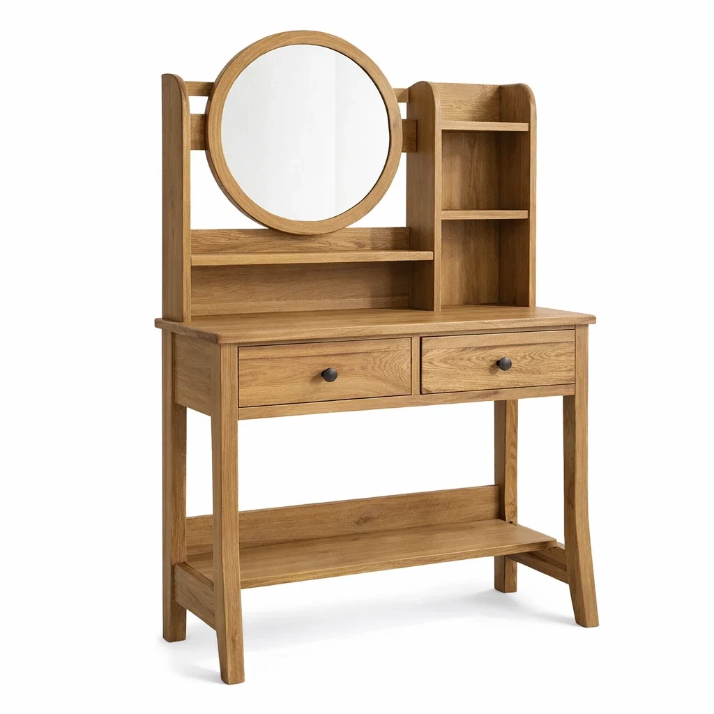 Schminktisch aus Massivholz Eiche mit Rundspiegel und zwei Schubladen